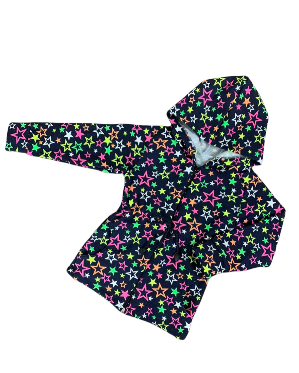 Куртка из тёплого и нарядного полотна.Застёжка на молнию,по линии талии затянут шнурок,по бокам удобные карманы.