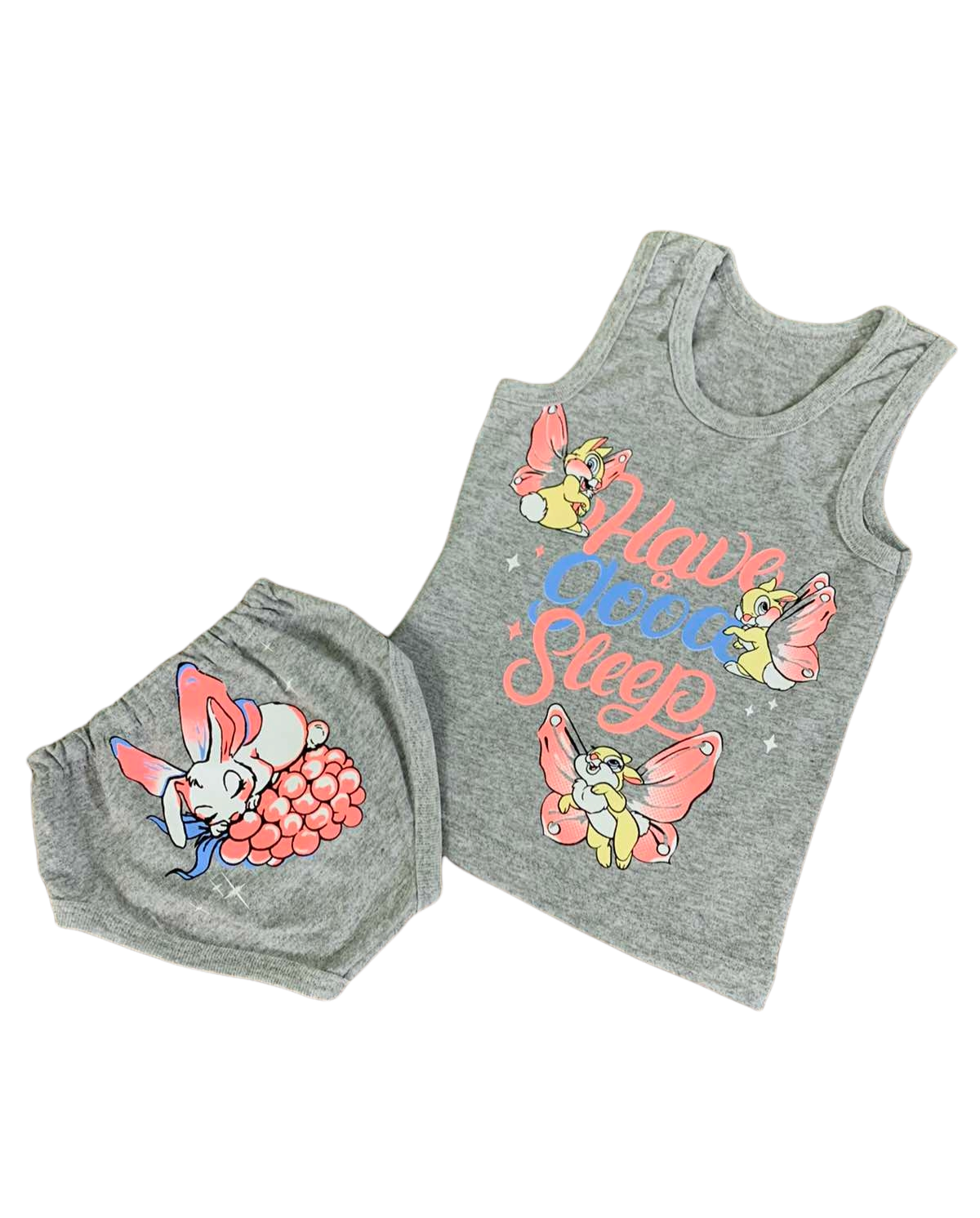 Маечка и трусики из яркого трикотажного полотна. Комплект украшен ярким принтом.